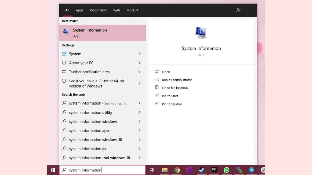 - Open the** Start Menu** and type System Information.