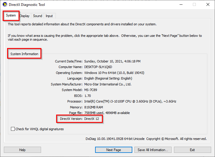 - You’ll see the tool launch. You’ll find the DirectX Version mentioned under System Information.