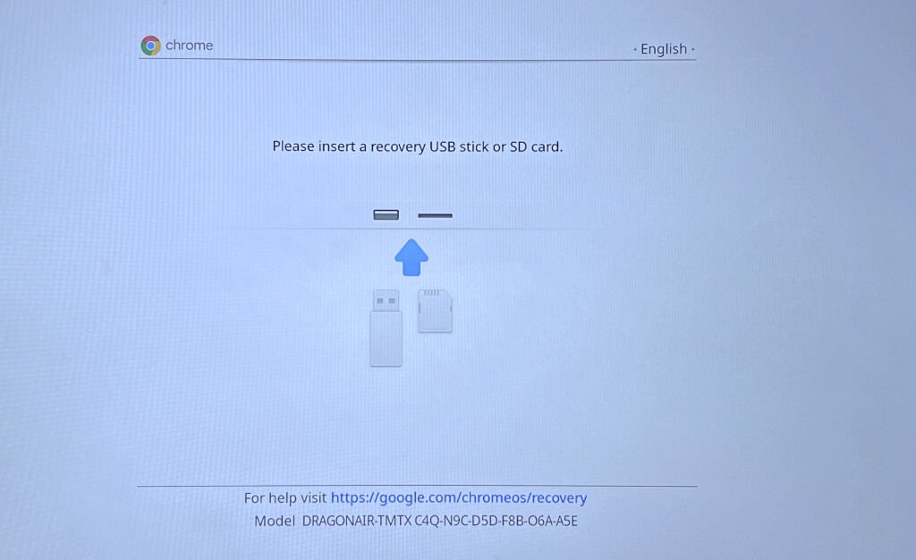 - Release all three buttons when your Chromebook displays a recovery screen with the“Please insert a recovery USB stick or SD card” message.