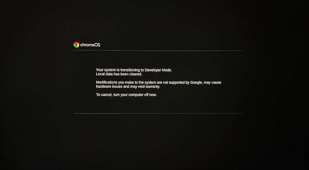 Alternatively, wait 10-20 seconds, and your Chromebook will automatically boot into Developer Mode after making a loud beep.