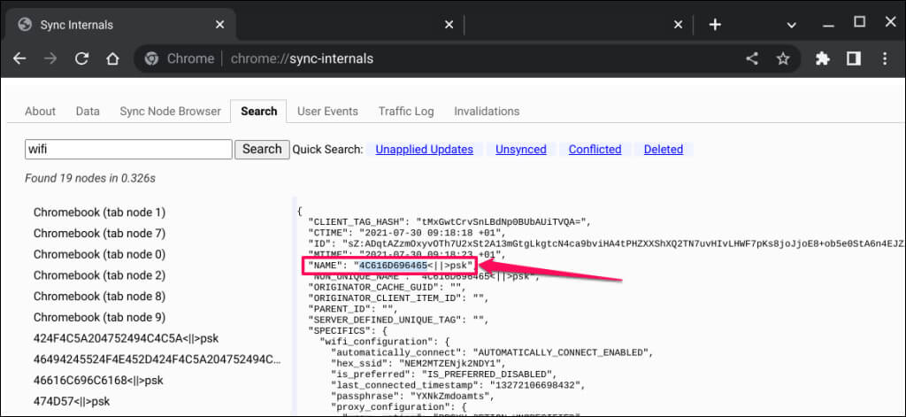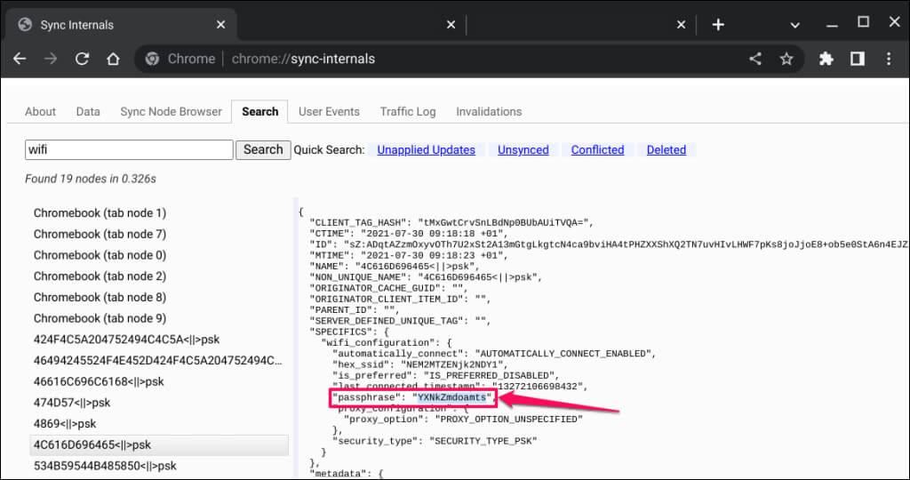 - Return to the Wi-Fi network’s page on Chrome’s “Sync internals” menu and copy the text in the “passphrase” row.