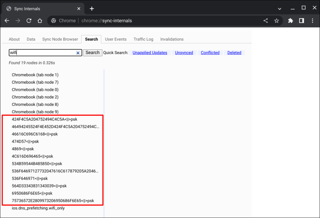 Results/nodes with “psk” at the end are the saved Wi-Fi networks on your Chromebooks. The alphanumeric characters before the “psk” are the encrypted Wi-Fi network name or SSID (service set identifier).