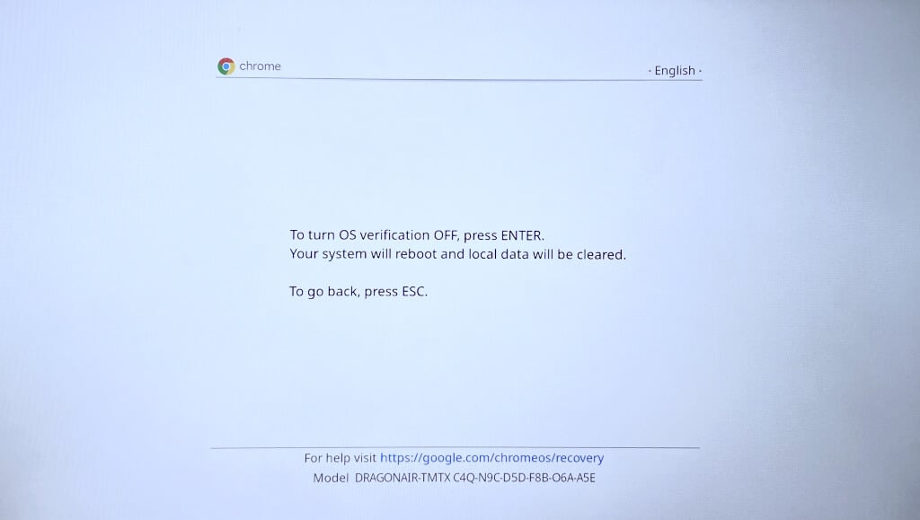 - Press Ctrl + D to enable Developer Mode. * Afterward, press Enter to turn off OS verification.