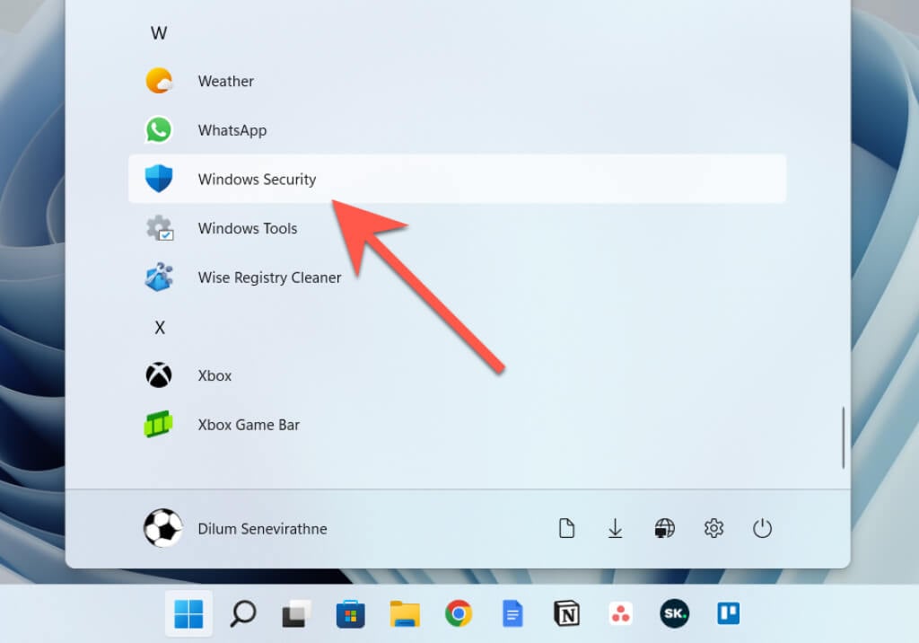 - Open the Start menu and select Windows Security on your programs list.