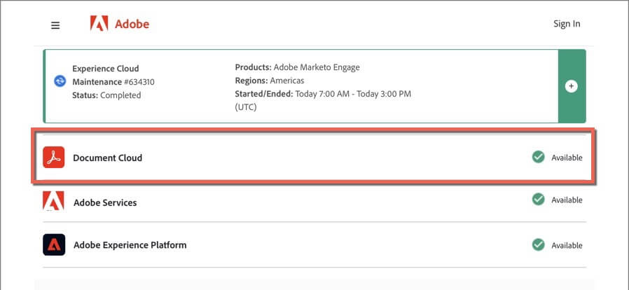 Head to Adobe.com’s System Status page using Microsoft Edge, Google Chrome, or another web browser on your PC or Mac. If Document Cloud or the other server categories appear down, wait until Adobe resolves the issue.