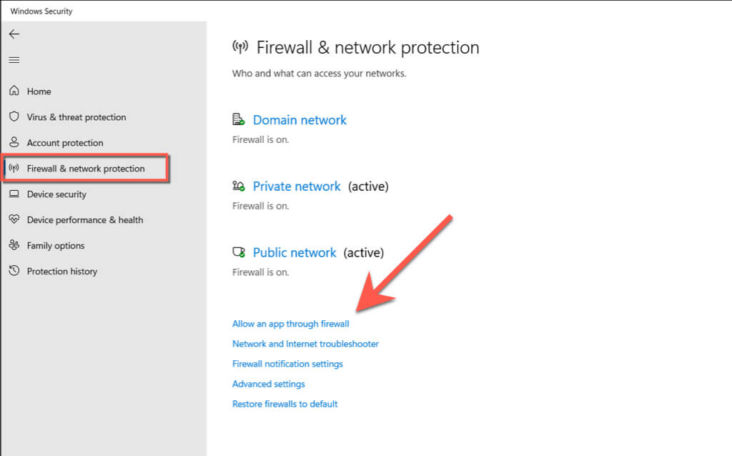 - Select Firewall & network protection > Allow an app through firewall.