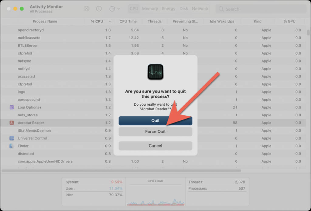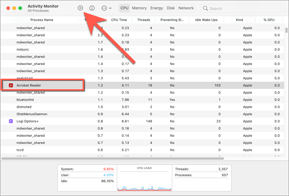 - Repeat for any other Adobe-related processes—e.g., AdobeCRDaemon. * Exit the Activity Monitor.