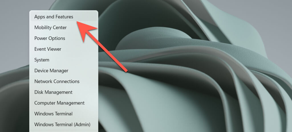 - Right-click the Start button and select Apps and Features.