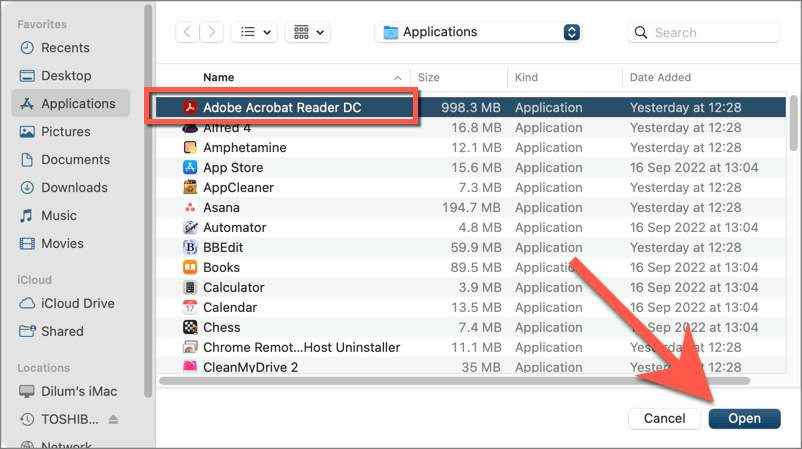 - Pick Adobe Acrobat Reader/Pro DC from the Applications folder and select Open.