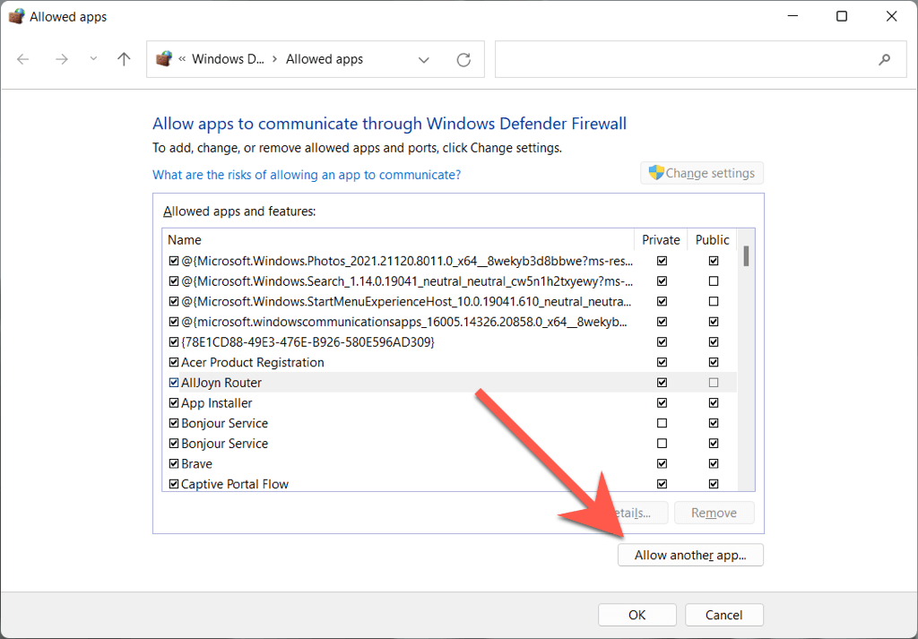 - Select Change settings > Allow another app.