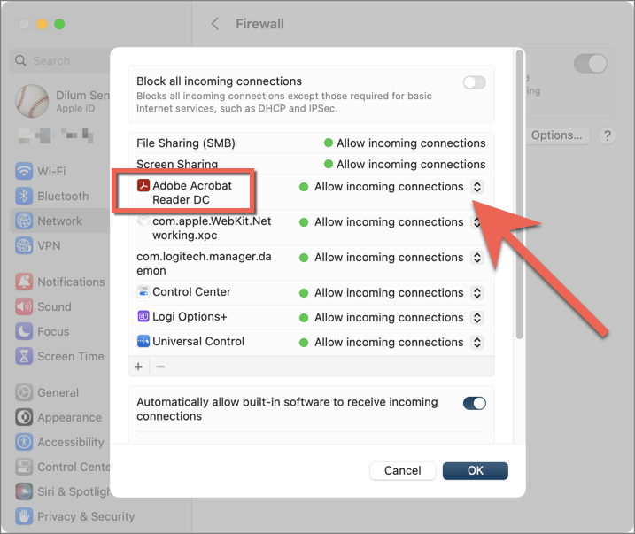 - Open the pull-down menu next to Adobe Acrobat Reader/Pro DC and select Allow incoming connections.