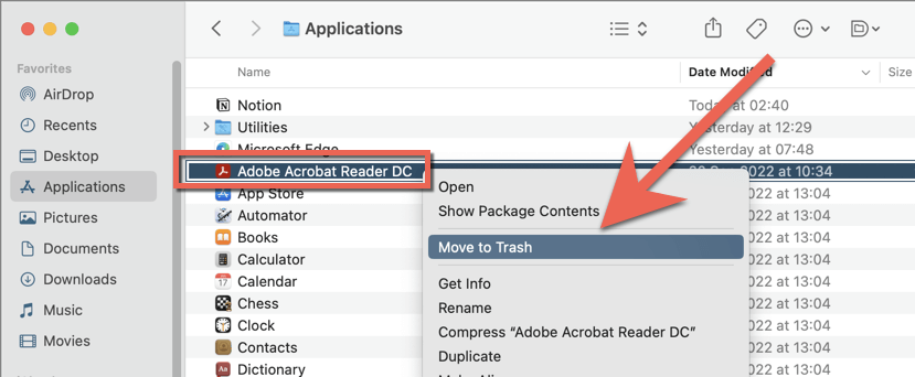 - Control-click or right-click Adobe Acrobat Reader/Pro DC and select Move to Trash.