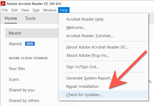 Adobe frequently releases updates that resolve persistent issues in Adobe Acrobat Reader and Pro DC. To check for and install pending updates, open the Help menu and select Check for updates. If there’s a pending update, select Yes to install it.