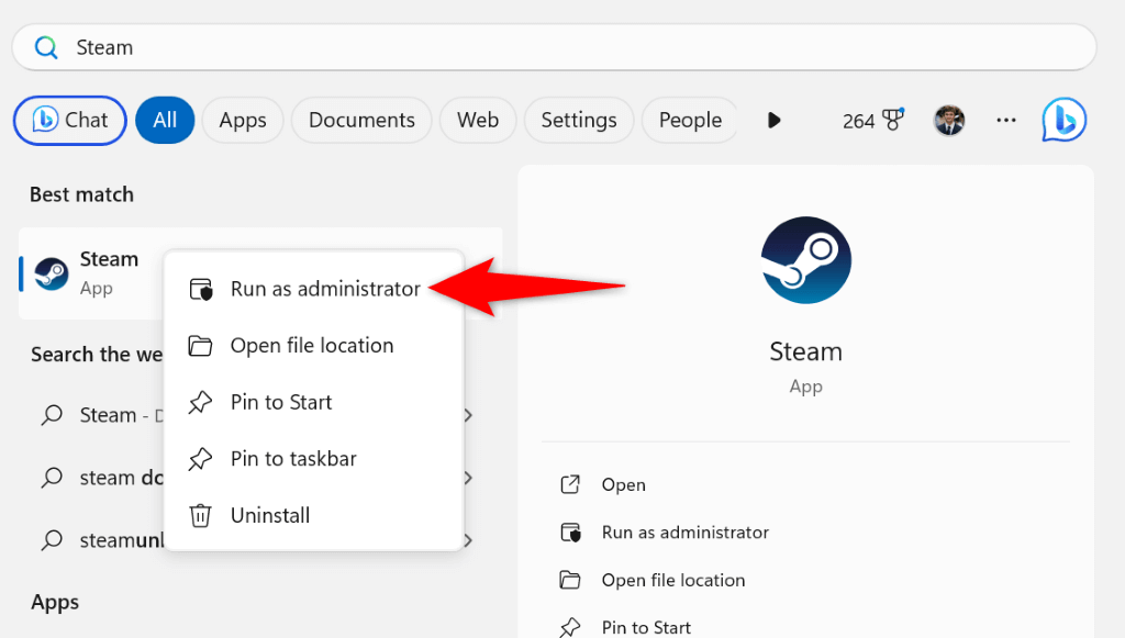 - Right-click the Steam app in your Start menu or desktop and choose Run as administrator.