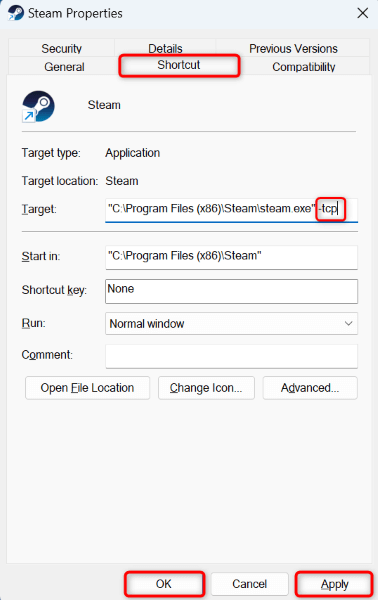 - Place your cursor at the end of the Target field, press Spacebar, and add the following parameter: -tcp
