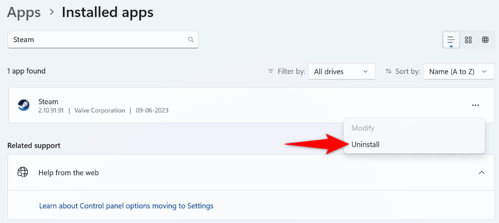 - Select the three dots next to Steam, choose Uninstall, and select Uninstall in the prompt.