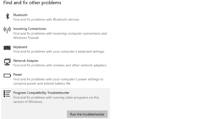 Open **Settings > Update & Security > Troubleshoot > Additional troubleshooters > Program Compatibility Troubleshooter. **Click the troubleshooter and then click Run the troubleshooter.