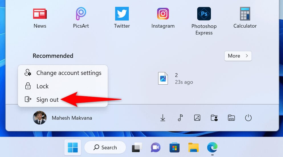 - Open the Start menu using the Windows key, select your account name, and choose Sign out.