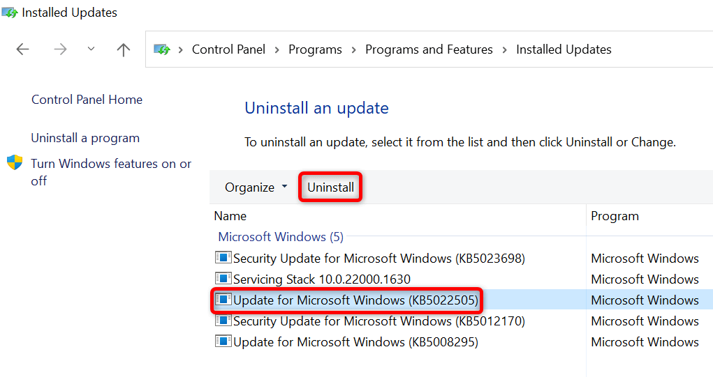 - Select the most recent Windows update on the right and choose Uninstall at the top.