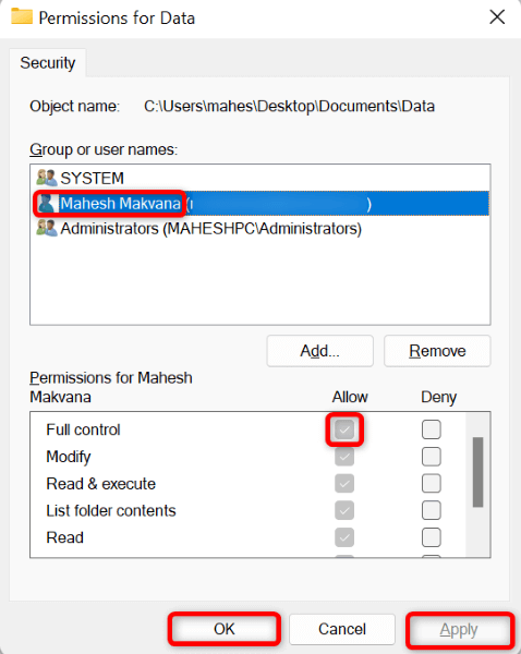 If you don’t have the permissions to edit the folder, ask an admin account holder on your PC to give you the permissions. Here’s what an admin needs to do to change permissions: