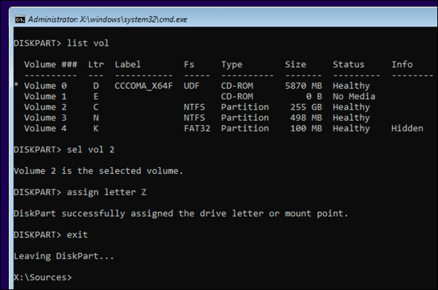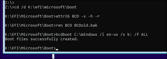 - Once assigned, type **exit** to close **diskpart**, then run the following commands sequentially to repair the existing GPT bootloader, replacing drive letters with the letter you assigned previously: **cd /d Z:efimicrosoftboot, attrib BCD -s -h -r, ren BCD BCDold.bak, bcdboot C:Windows /l en-us /s k: /f ALL**. If the commands are successful, type **shutdown /r** to restart your PC.