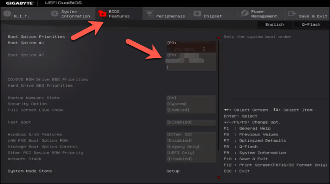 - The BIOS or UEFI settings menu will differ from device to device. Locate the **device boot options **in your menu and change the order using the on-screen instructions, making sure that your Windows system drive is in the first position.