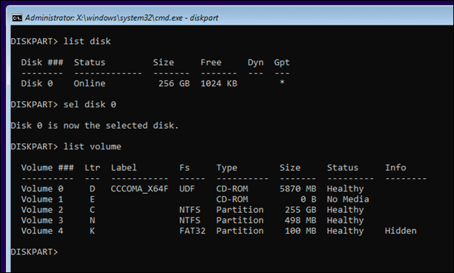 - In the command prompt window, type **diskpart**, then **list volume. **This will give you a list of available drives, as well as their drive letters. Make note of the drive letters assigned to the drive containing your existing Windows installation and to the smaller **System Reserved **partition.