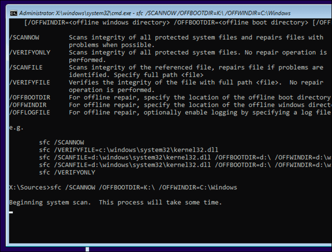 - Once you know your system drive letter, type **exit** to exit **diskpart**, then ype **sfc /scannow /offbootdir=C: /offwindir=D:Windows**, replacing the file paths for **offbootdir **with the drive letter assigned to your **System Reserved **partition (usually 100MB in size) and **offwindr **with the drive letter assigned to your existing Windows installation. If your System Reserved partition isn’t assigned a drive letter, type **sel vol 0** (replacing **0** with the correct volume number), then type **assign letter Z: **before typing **exit**.