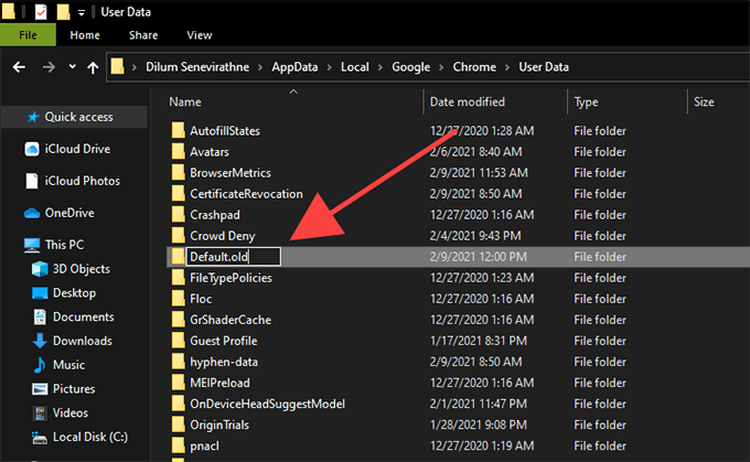 - Rename the folder labeled Default to Default.old.