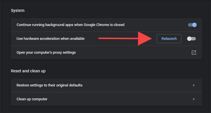 Go to Chrome’s **Settings **screen and select **Advanced **> **System **on the sidebar. Then, turn off the switch next to Use hardware acceleration when available and select Relaunch.
