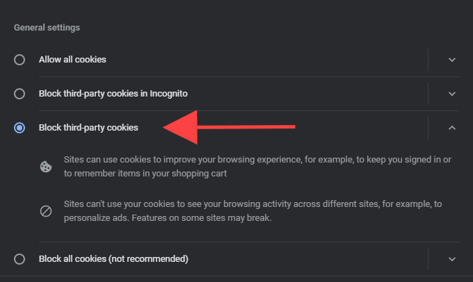 To do that, open the **Chrome **menu and select Settings. Then, select **Privacy and Security **on the sidebar and pick the option labeled Cookies and other site data. On the screen that follows, select Block third-party cookies.