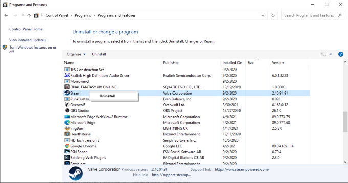 If all else fails, you can completely remove Steam from your computer and reinstall it. To remove Steam, open **Control Panel > Uninstall a program **and right-click on Steam. Choose **Uninstall. **Once you remove Steam, restart your PC before installing it again. Bear in mind that doing this will remove *all *Steam content, including downloaded games.