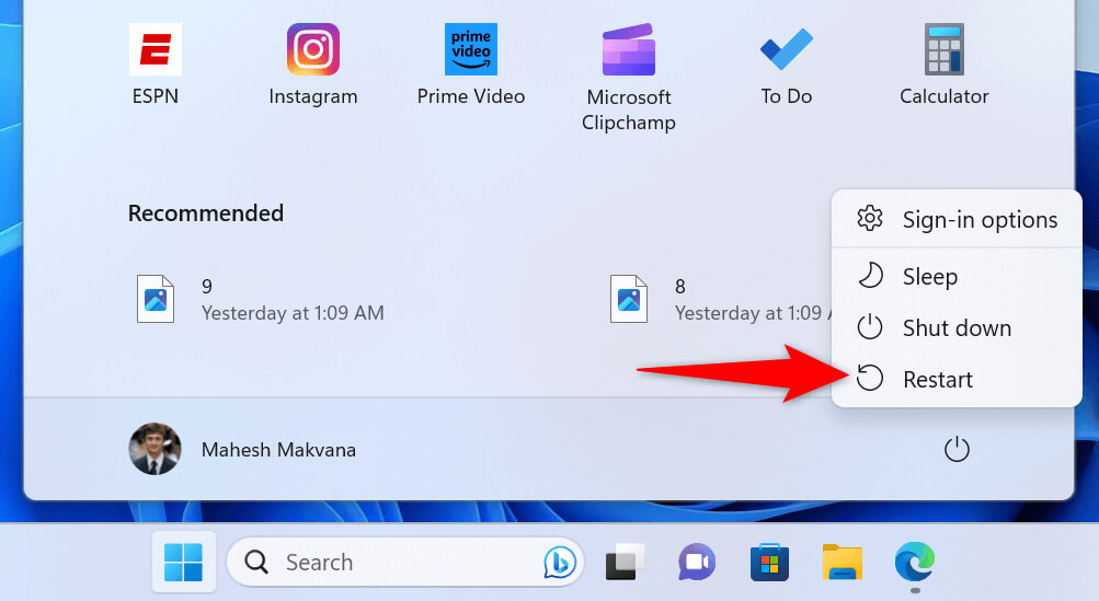 - Choose Restart in the menu to turn your PC off and back on.