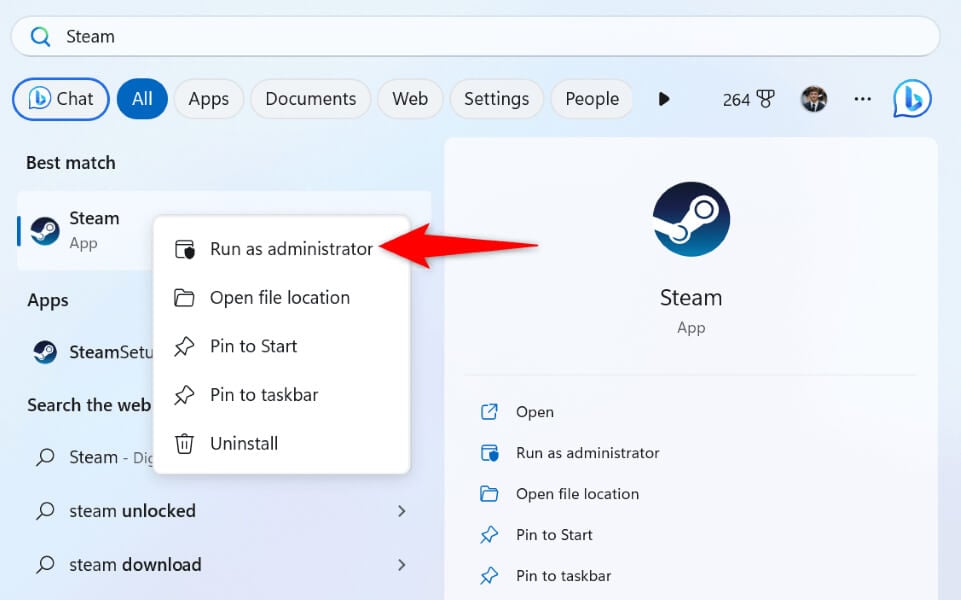 - Right-click the app and choose Run as administrator.