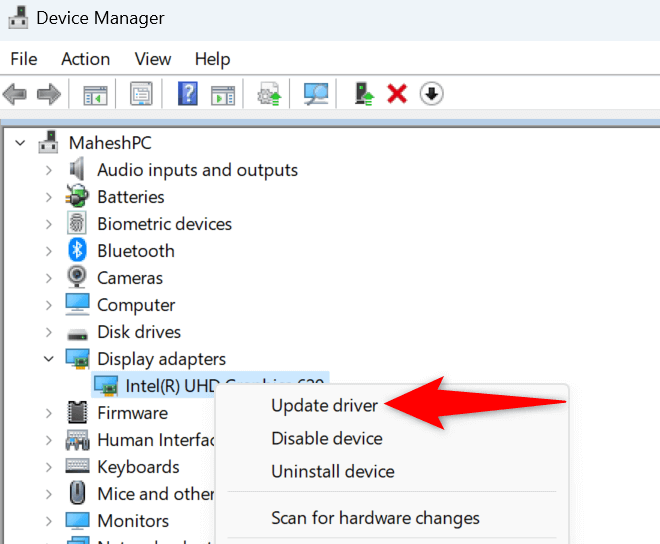 - Expand Display adapters, right-click your graphics adapter, and choose Update driver.