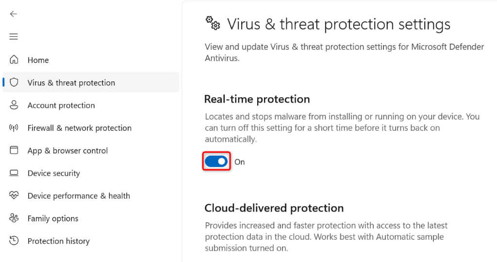 - Turn off the Real-time protection toggle.