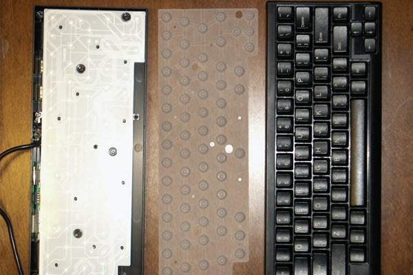Flip over your keyboard and remove the screws one by one. Eventually, you’ll be able to remove the top layer of the keyboard to get to the underlying layer. If this is a membrane keyboard, you’ll find one or two thin membrane layers that cover the entirety of the keyboard.