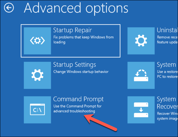 - Select **Command Prompt **in the **Advanced options **menu to boot to a minimal version of Windows, showing only a command prompt window.