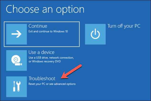 - In the **Choose an option **menu, select the **Troubleshoot** option.