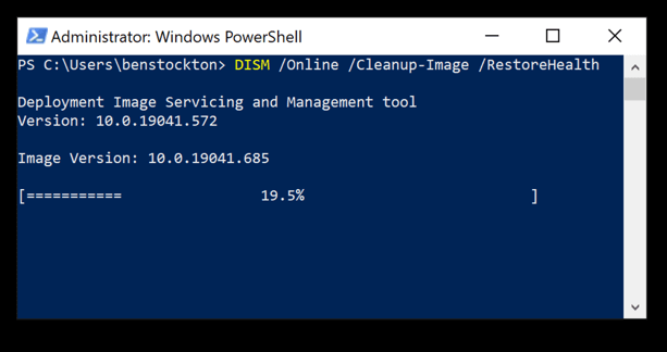 - In the PowerShell window, type **DISM /Online /Cleanup-Image /RestoreHealth **and allow the process to complete, which could take some time.