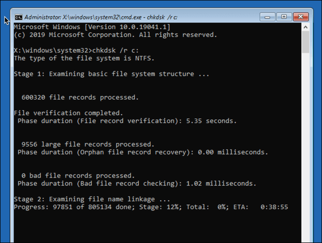 - In the command prompt window, type **chkdsk /r c: **to begin a low-level check of your system drive for errors using the Check Disk utility. If it detects errors, **chkdsk** will automatically repair them (if possible).