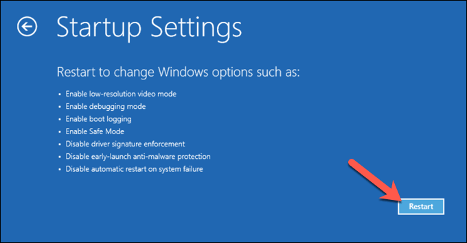 - In the boot troubleshoot menu, select **Troubleshoot** >** Advanced options** >** Startup Settings** >** Restart.**