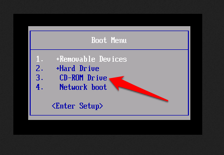 - Next, reboot your PC and when you see the manufacturer’s logo, press the Boot menu option severally to enter the boot menu. Select CD/DVD ROM or USB.