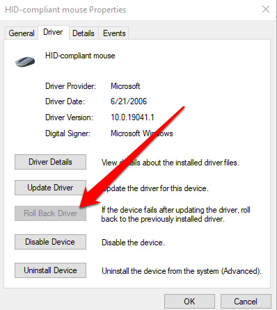 - Next, select **Drivers** and then select **Roll Back Driver**.