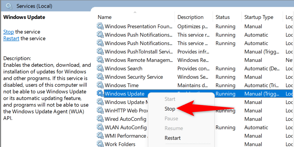- Find the Windows Update service, right-click the service, and choose Stop. Keep the Services window open while following the below steps.