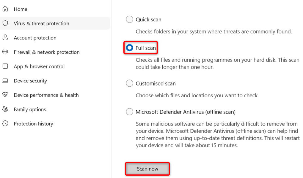 - Select Full scan and choose Scan now at the bottom.