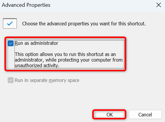 - Turn on the Run as administrator box and select OK.