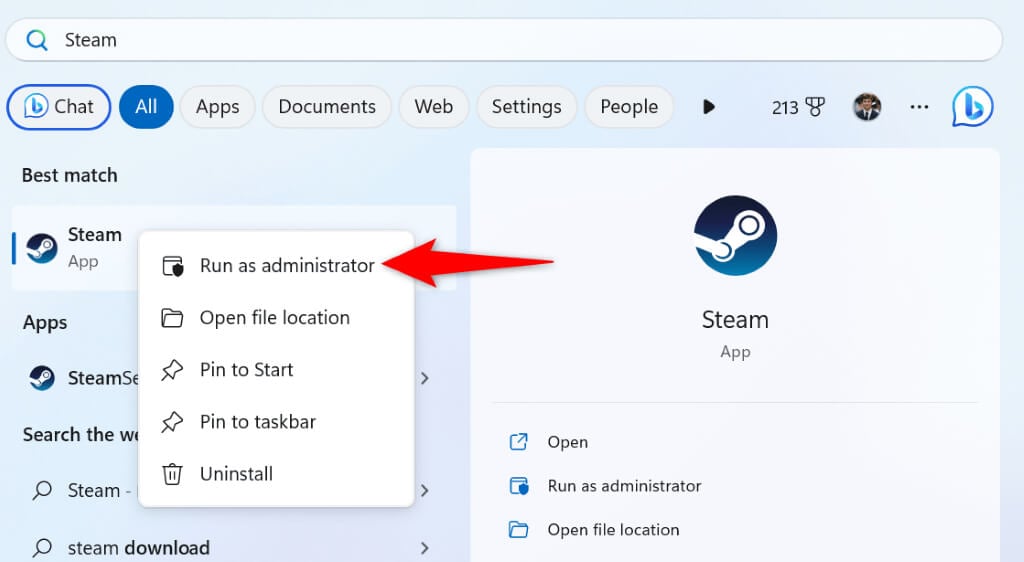 - Right-click Steam and choose Run as administrator.