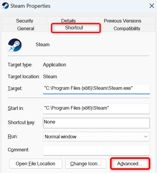 - Select the Shortcut tab in Properties and choose Advanced.