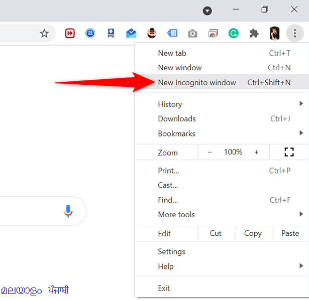 - Select the three dots at the top-right corner of Chrome and choose New Incognito Window. Alternatively, press **Ctrl **+ **Shift **+ N on your keyboard.